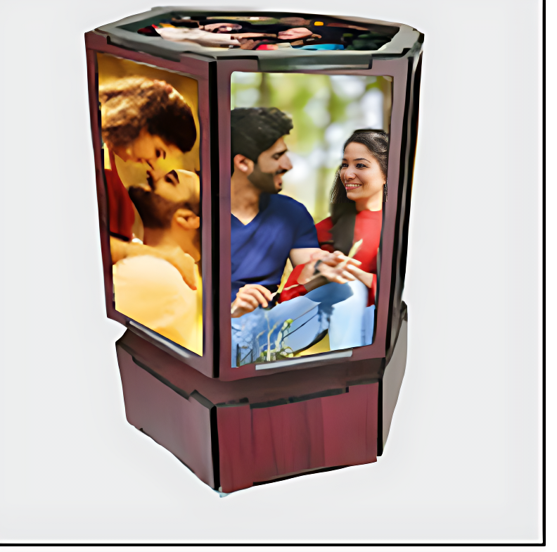 customized hexagonal lamp that rotates 360 degrees to showcase your cherished memories with warm LED illumination, offering unique design and a personal touch.